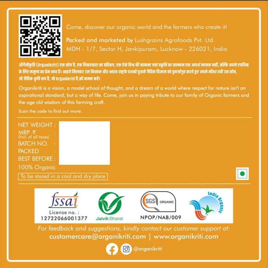 100 % Organic and unadulterated. Grown without synthetic Pesticides and GMOs.