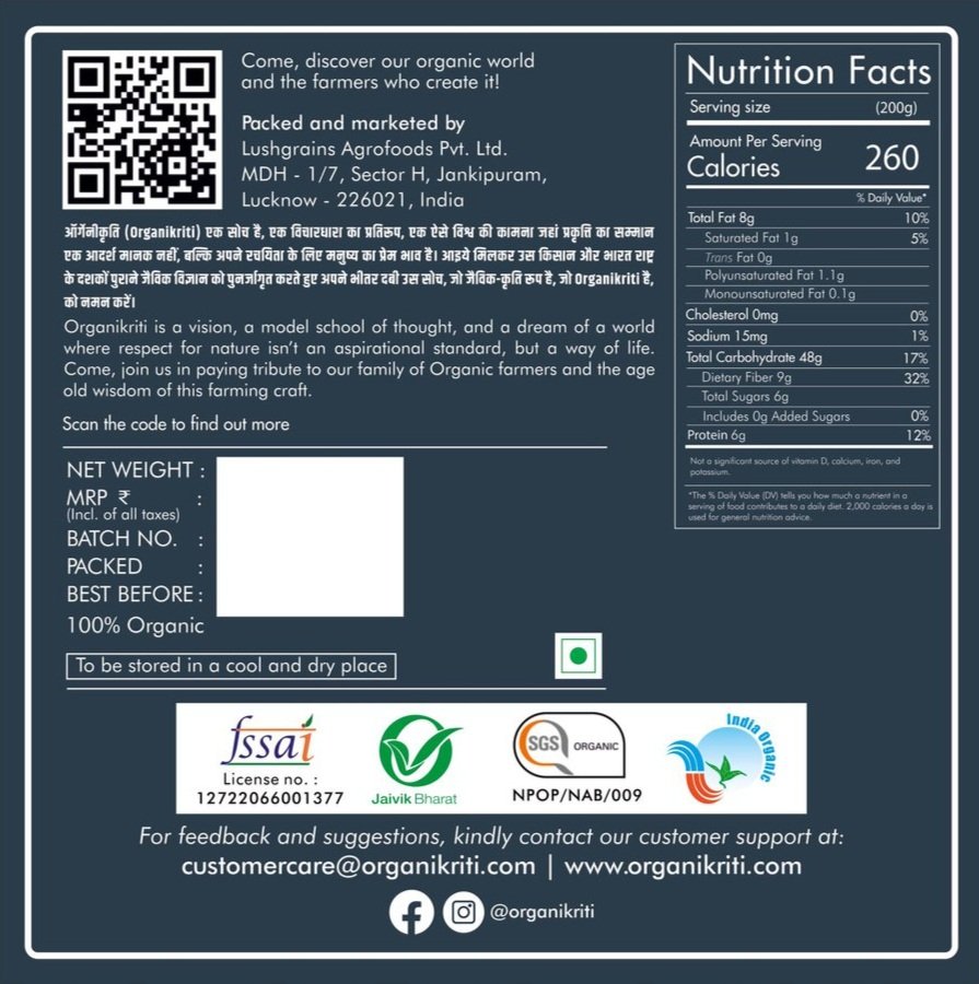100 % Organic and unadulterated. Grown and produced without synthetic Pesticides and GMOs.