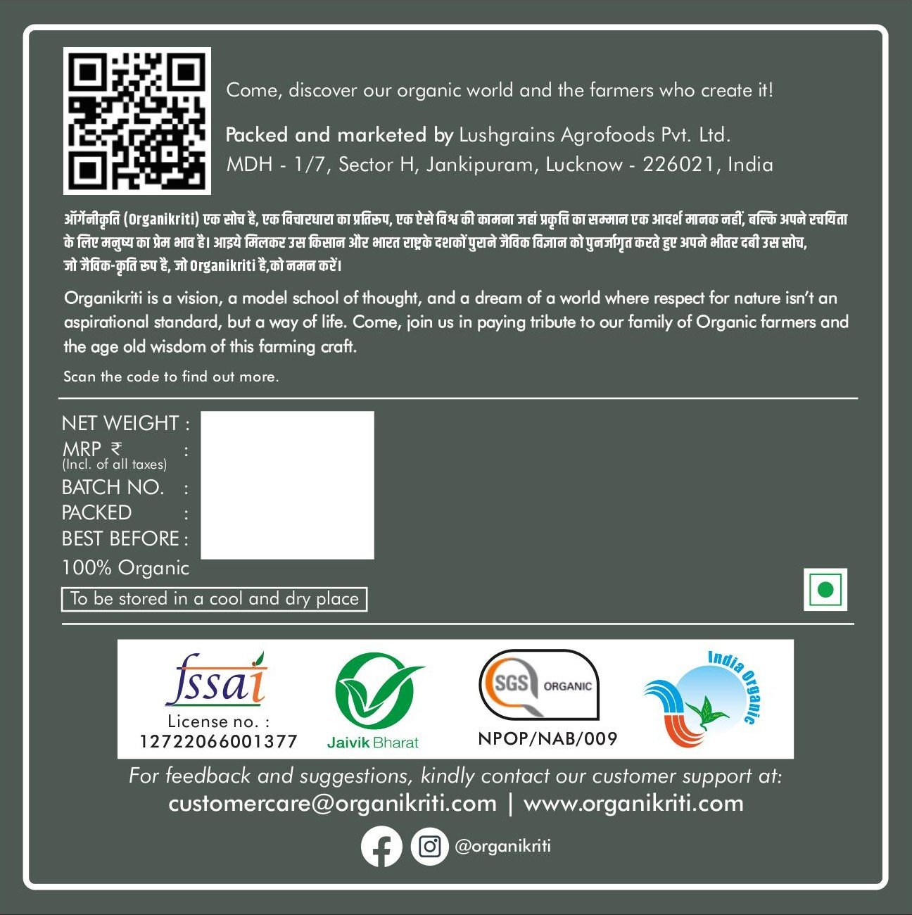 100 % Organic and unadulterated. Grown without synthetic Pesticides and GMOs.