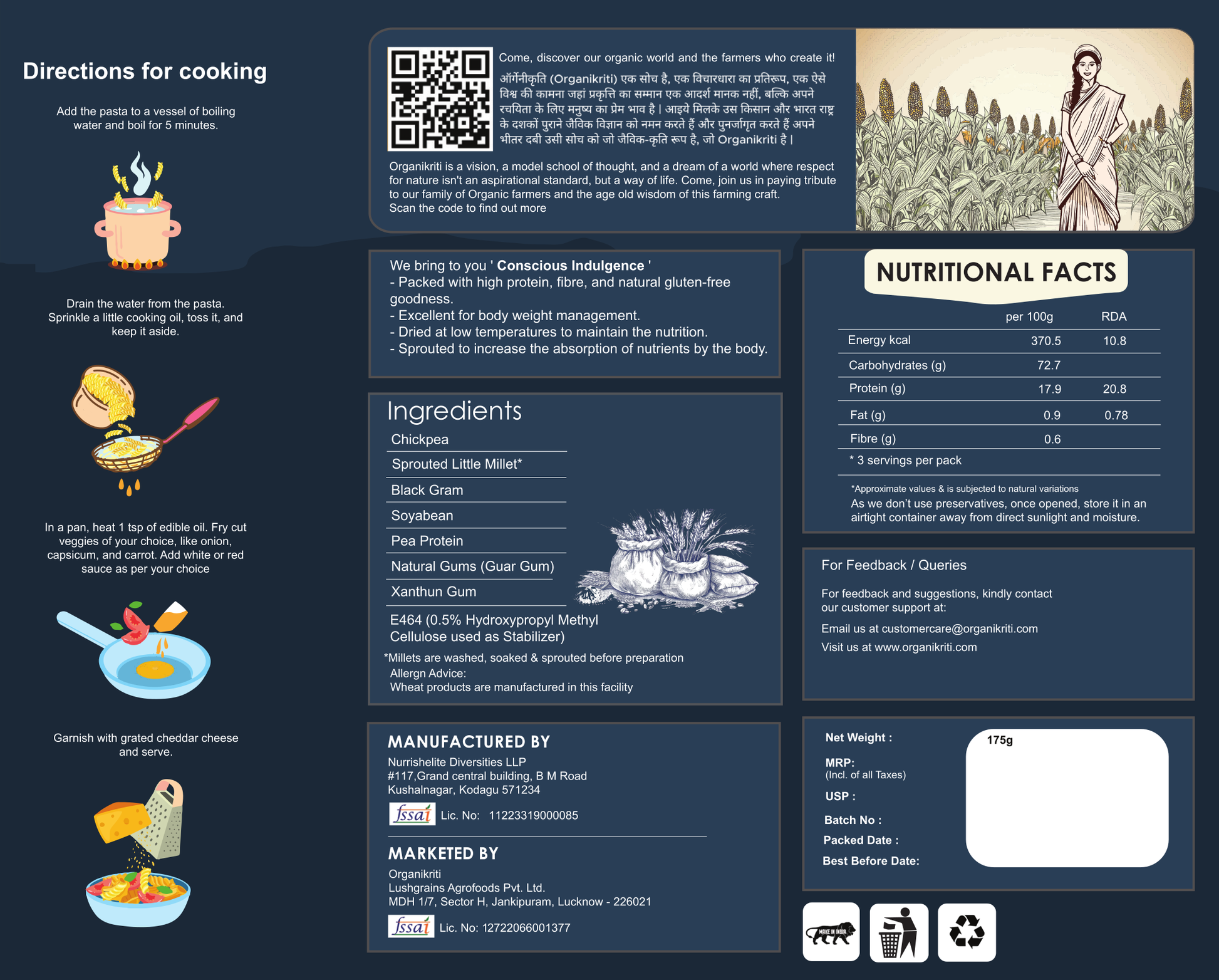 Organikriti’s Gluten - Free Sprouted Millet Pasta is a wholesome and nutritious twist on traditional pasta, made entirely from organic millets. With a delightful texture and natural flavors, this pasta offers a healthy way to enjoy your favorite pasta dishes. Rich in fiber, and free from any artificial additives, it’s a perfect choice for a quick, satisfying meal without compromising on health.